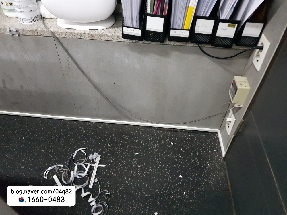 전원 어댑터와 멀티탭은 벽면 상단으로 이동해 바닥 공간을 완전히 비워냈습니다. 사진에서 보이던 초기의 ‘케이블 산’이 사라지면서 작업 환경이 넓어졌고, 청소 역시 편리해졌습니다. 불필요하게 길게 늘어진 선들은 케이블 타이로 묶어 장비 뒤편으로 자연스럽게 흘러가도록 정리해 랜공사 전과 후의 차이가 한눈에 드러났습니다.