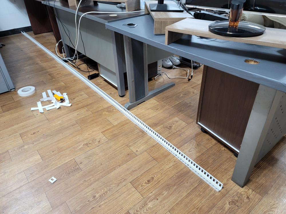 먼저 사무실 전체 구조와 동선을 확인했습니다. 사진처럼 공간이 넓고 책상 배열이 길게 이어진 구조에서는, 케이블을 바닥으로 노출시키는 방식이 가장 큰 위험 요소가 됩니다. 창가 벽면과 코너를 따라 안전한 경로를 잡고, 서브 위치에서 각 좌석까지 필요한 길이를 계산해 불필요한 여유가 남지 않도록 네트워크 연결 경로를 설계했습니다.