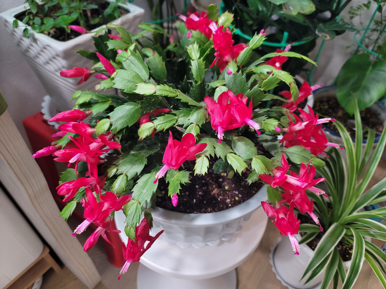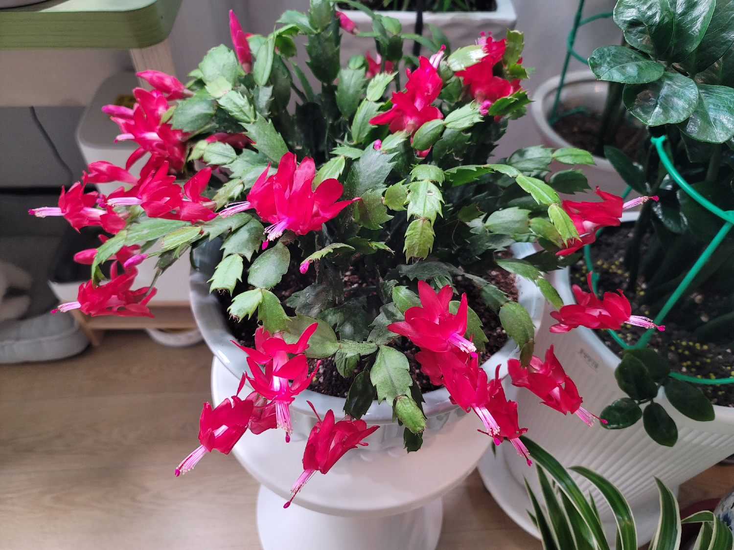 크리스마스 선인장은 강한 직사광선보다는 밝은 간접광을 선호합니다. 사진 속처럼 실내 한켠, 다른 관엽식물과 함께 두어도 조화롭게 어울립니다. 온도 변화에 비교적 강하고, 난방이 있는 겨울철에도 안정적으로 꽃을 피워 관리 부담이 크지 않은 점이 장점입니다.